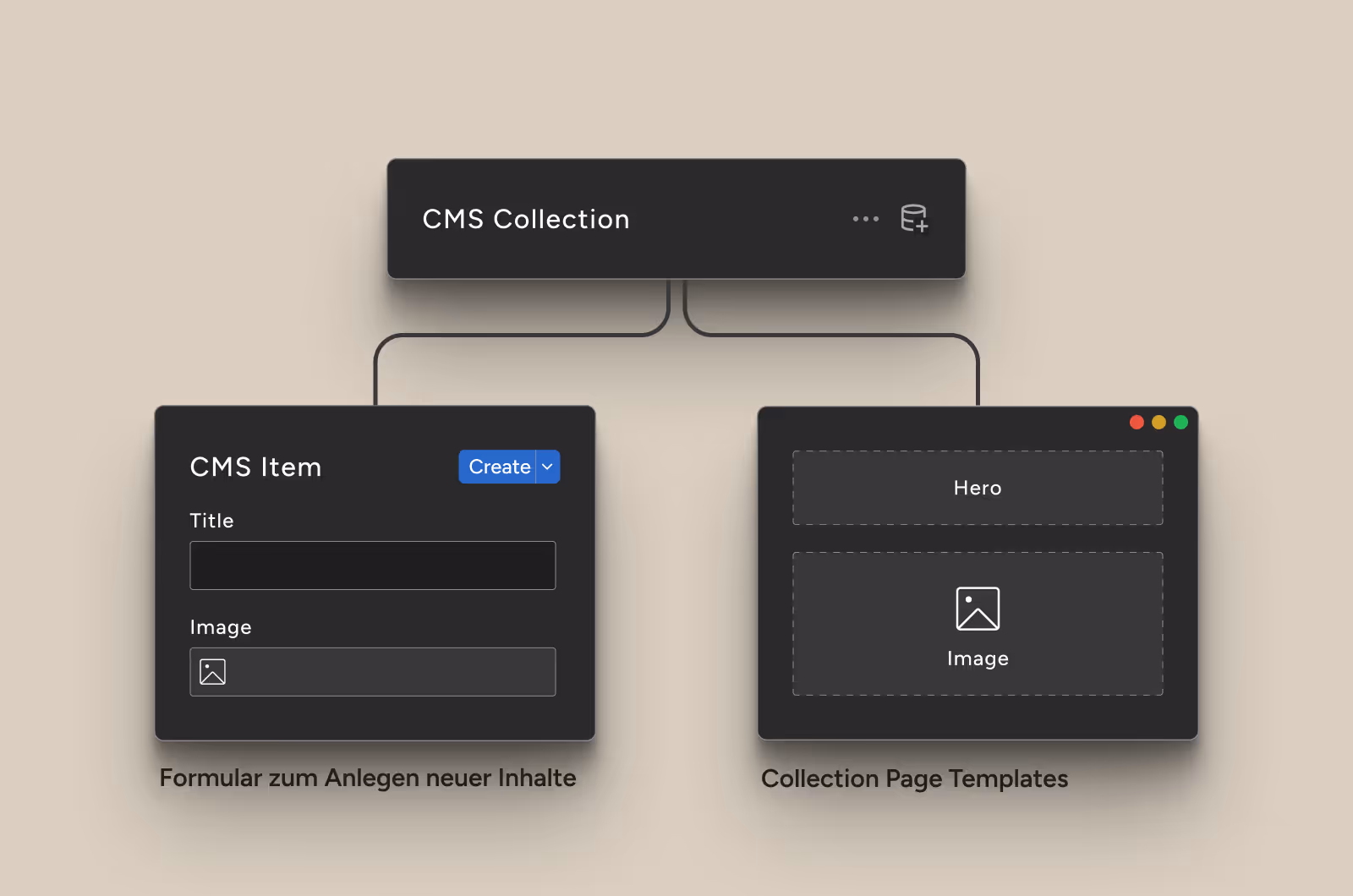 - CMS collections, which you can think of as a database. There is a mask into which you can enter the content and a template that outputs this content.